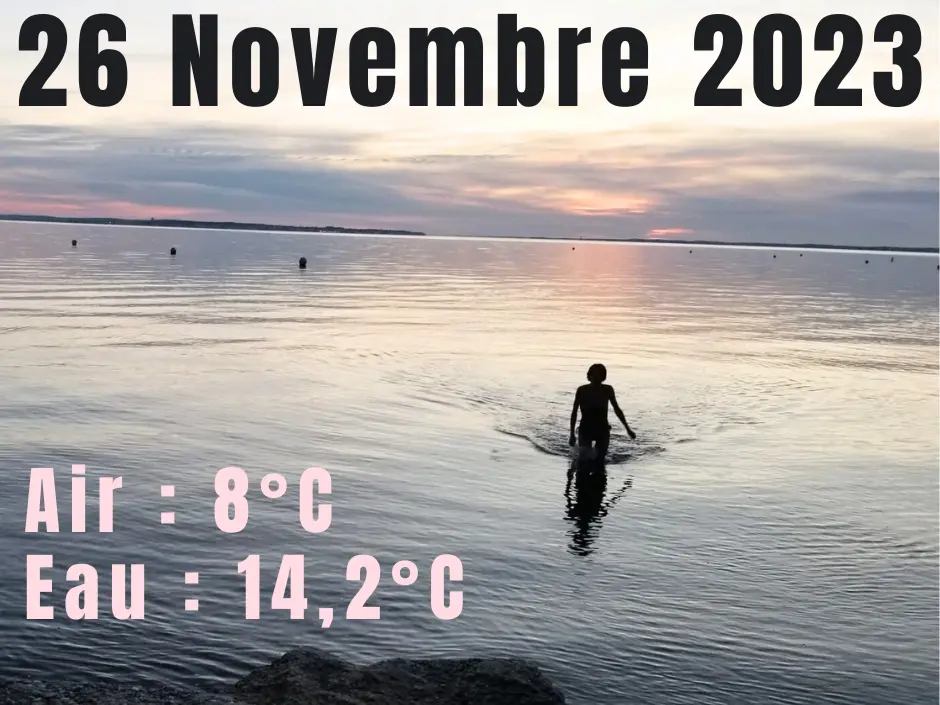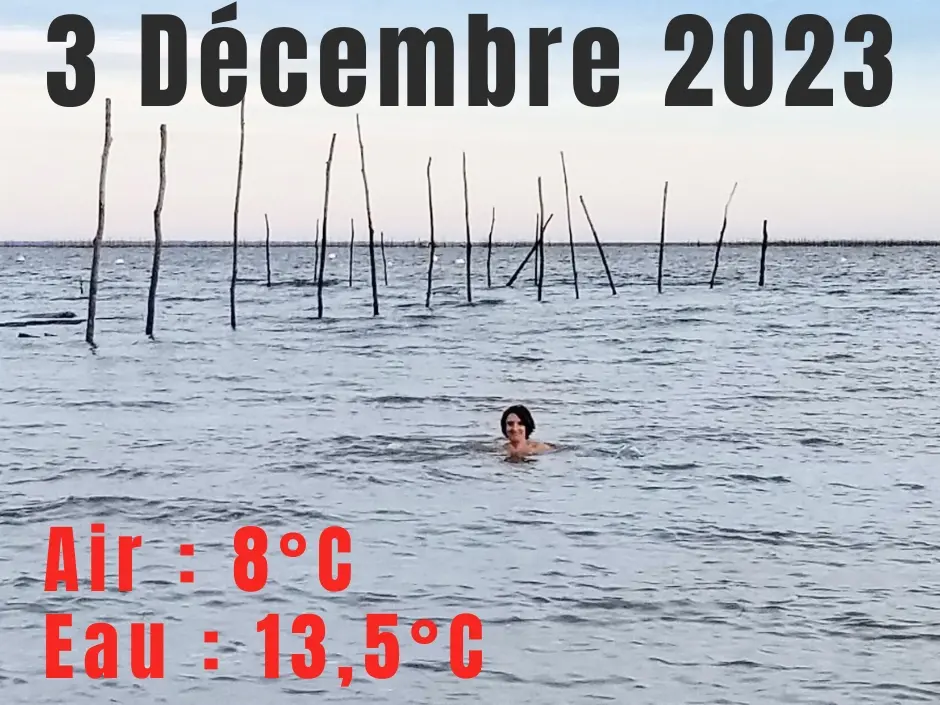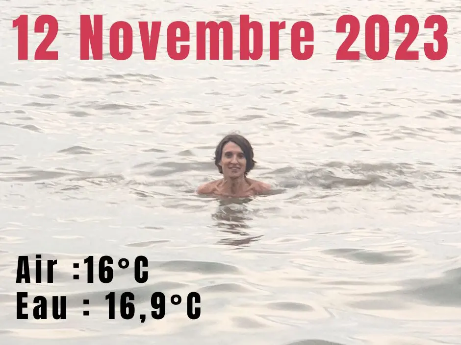C’est très étonnant d’observer mes ressentis. Ce jour là, les températures de l’air et de l’eau étaient exactement les mêmes que celles du 29/10… par contre, les ressentis étaient complètement différents (j’ai une hypothèse… j’attends de la vérifier avant de vous la partager). L’eau m’a semblé fraîche mais pas du tout froide et je suis rentrée dans l’eau très facilement. La seule difficulté s’est située dans le déshabillage à cause de la présence de vent. Mais cela ne dure que quelques secondes ! Quand on sort de l’eau, la sensation est très agréable, on a chaud malgré le vent.