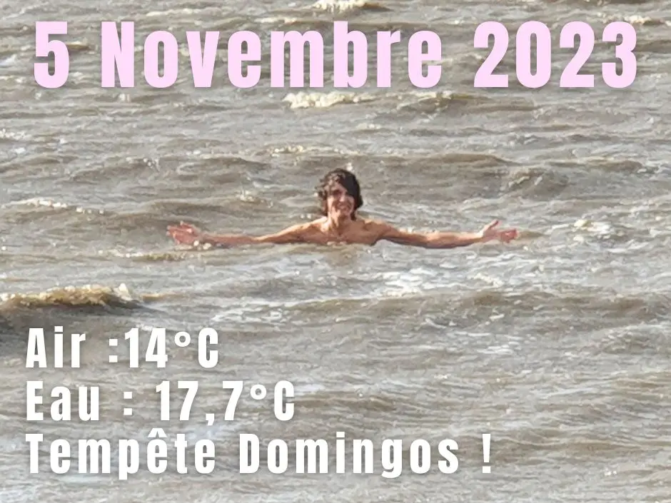 Une journée durant laquelle il a beaucoup plu… Quand il pleut, cela demande une certaine organisation pour éviter de tremper mes vêtements qui m’attendent sur la plage. Je n’avais pas prévu cet élément ! Mais j’ai réussi à me baigner pile entre 2 averses ! Ce jour là, le ressenti de la température de l’eau était très froid !!!! J’ai mis un peu de temps avant d’immerger le corps entier ! En sortant de l’eau, je n’ai absolument pas eu froid. Au niveau des jambes, la peau me donnait même la sensation de brûler !!! Sensation très étrange. Je n’ai pas de photo car il faisait nuit !
