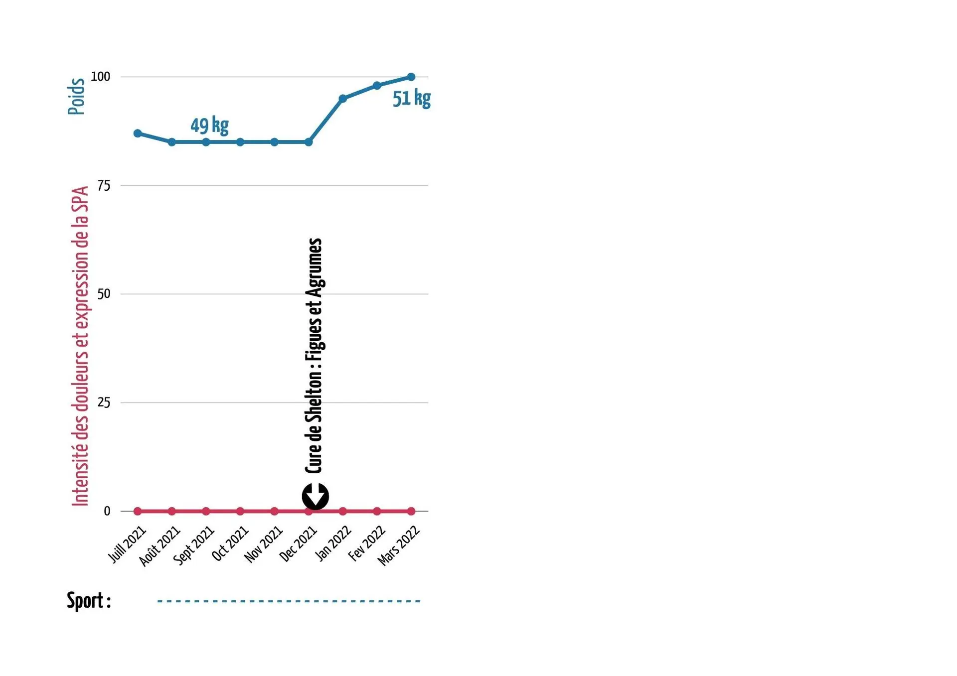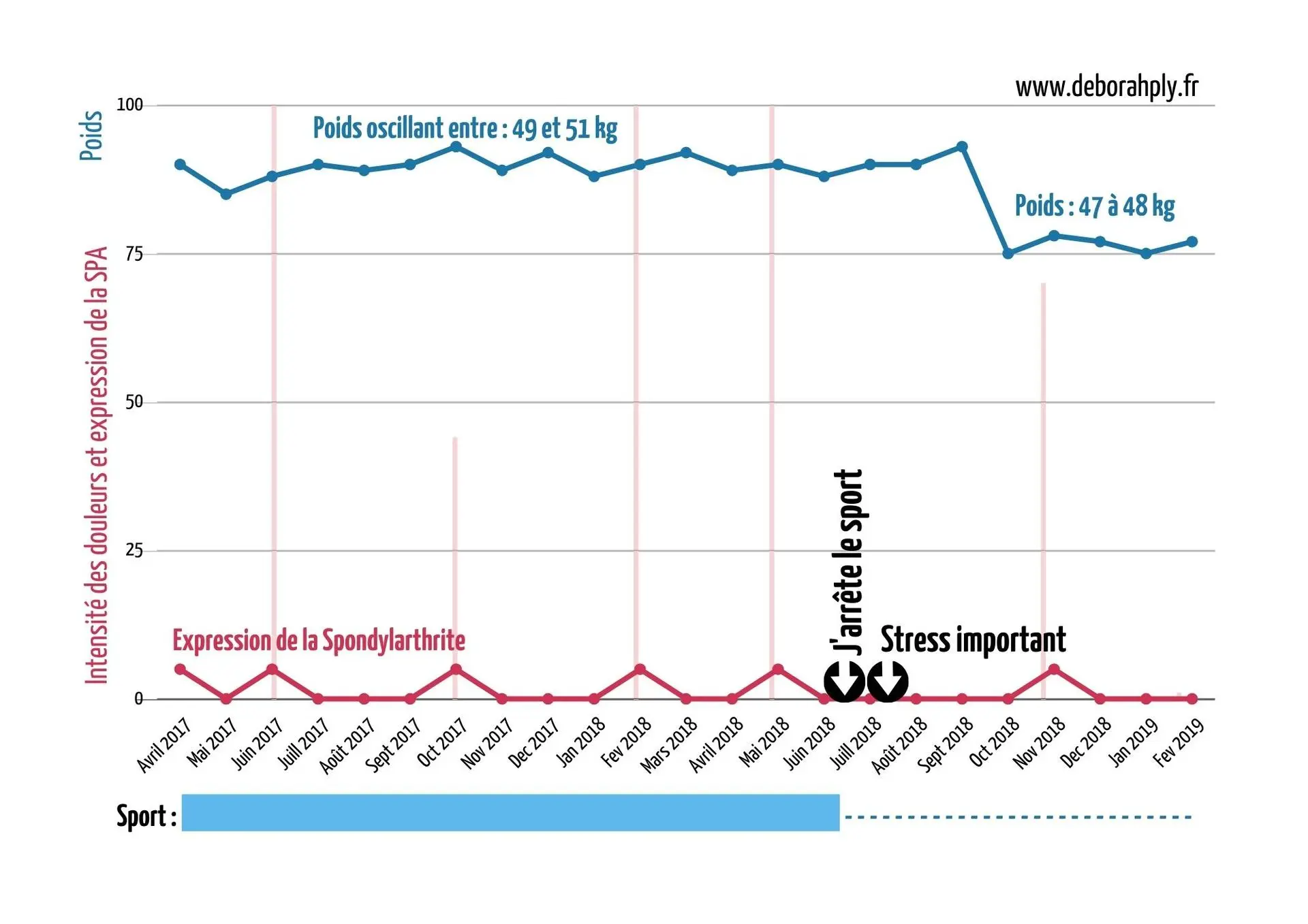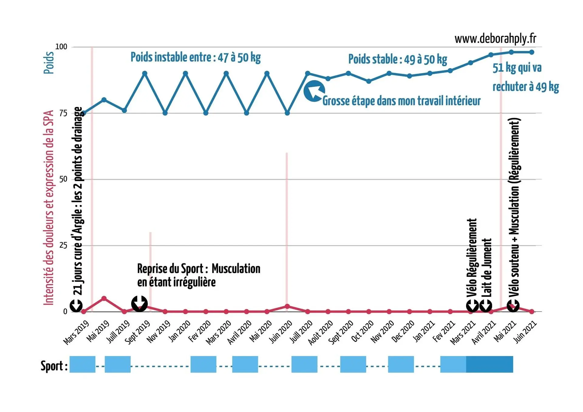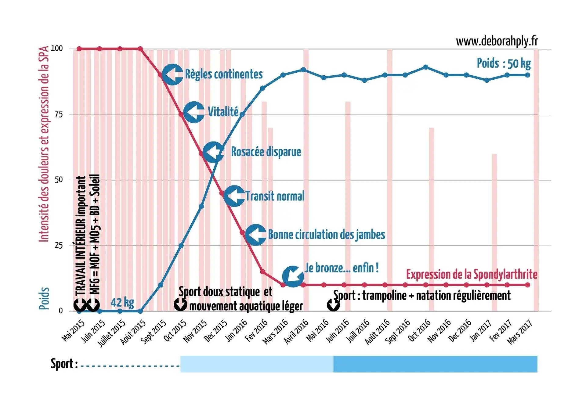 Les flèches bleues du premier graphique indiquent mes cerises sur le gâteau ! Ce sont tous les maux à bas bruits qui ont disparu alors que je ne m’y attendais pas du tout. J’avais mis en place mon Travail intérieur et la Méthode France Guillain dans le but de réduire au silence la SPA et je ne pensais pas à ces petits travers qui ne pesaient pas lourd face à la spondylarthrite !