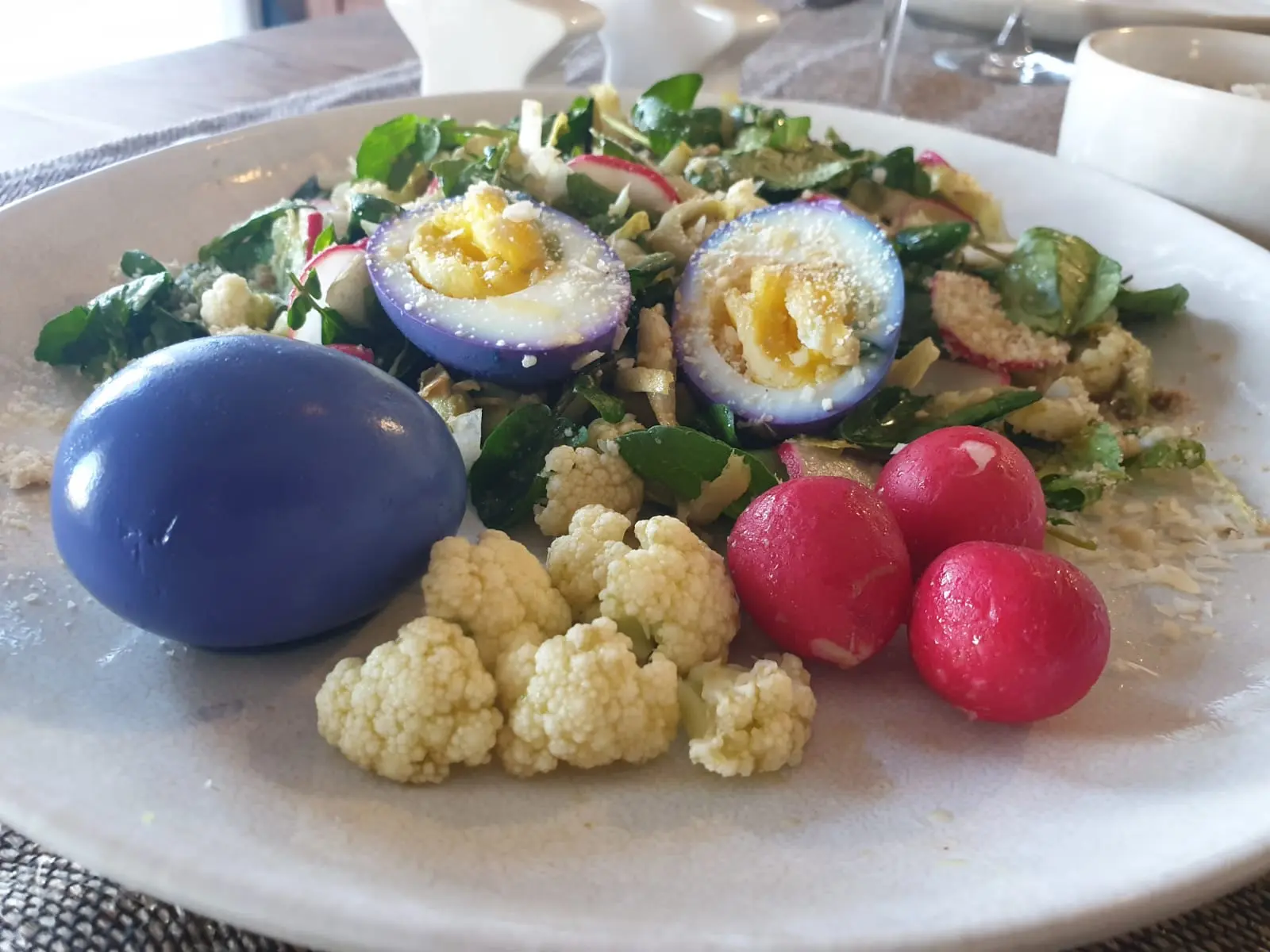 À votre avis, comment ai-je pu colorer l’œuf en bleu ? Mes enfants ont l'astuce, cet effet bleu se produisait spontanément dans leurs assiettes quand ils étaient petits. Pour un effet plus intense, j'ai laissé la réaction se faire toute la nuit.