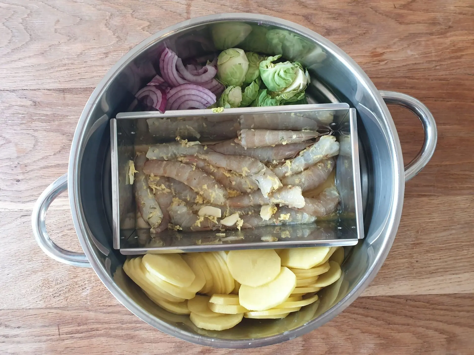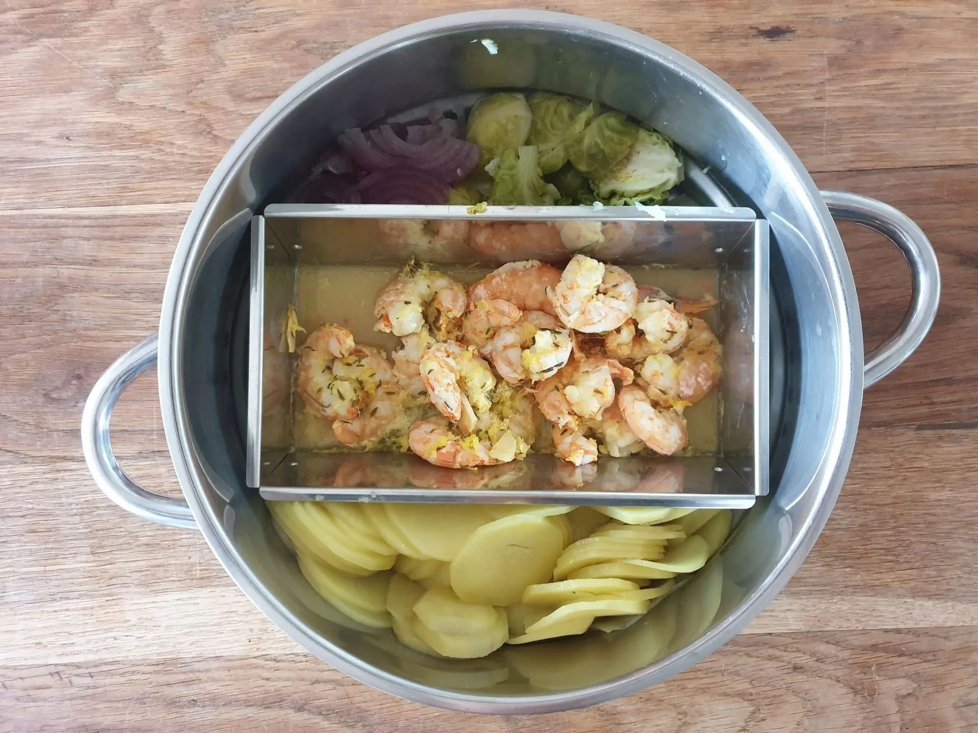 Pour cuire les Gambas à la vapeur dans sa marinade, j'utilise le vitaliseur de Marion et son moule à cake. Cela me réserve de la place sur les côtés pour cuire les légumes et les pommes de terre.