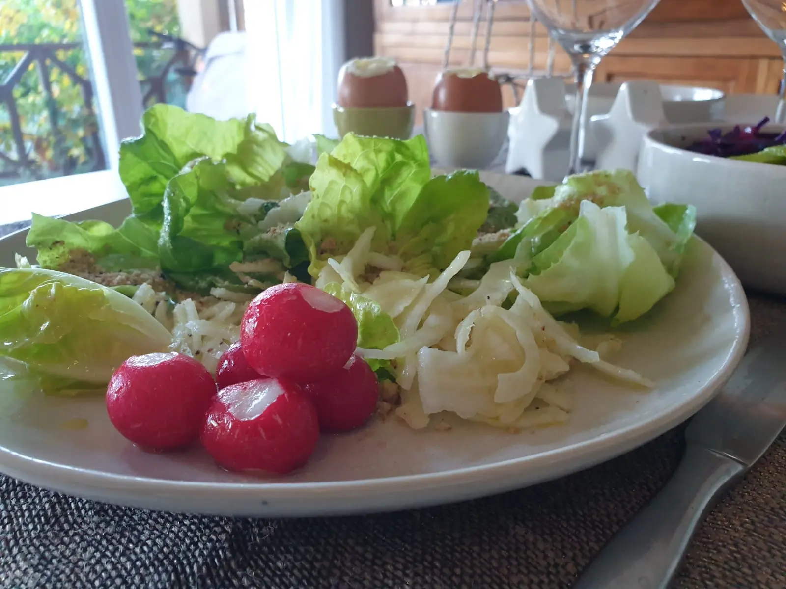4 : Crudités / Légumes : Salade, fenouil, radis roses / Chou rouge, poireaux