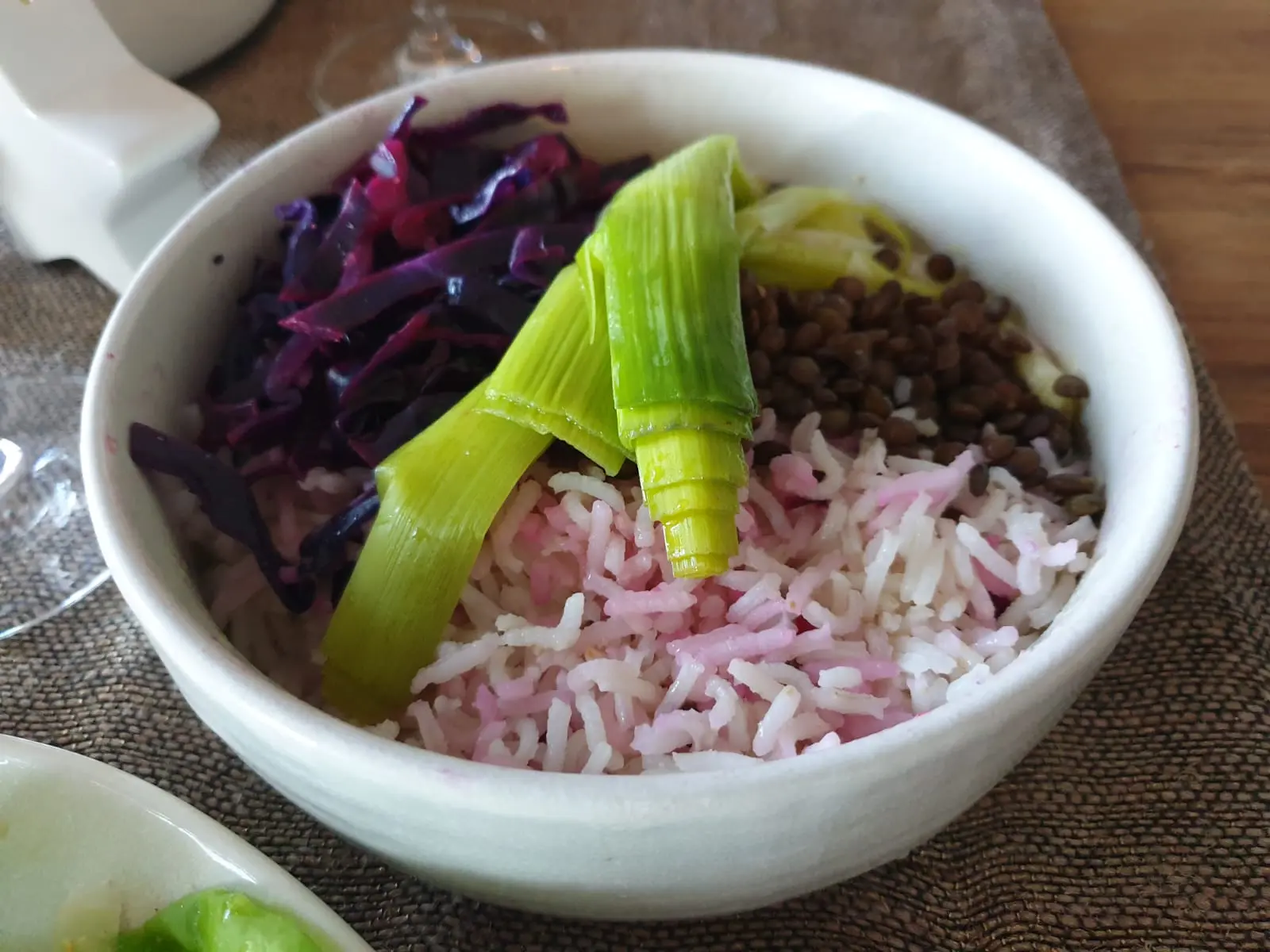 Pour obtenir ce riz rose : versez un jus de citron sur le chou rouge : sa couleur va éclaircir. Les aliments de couleur clair qui sont à son contact deviendront rose.
