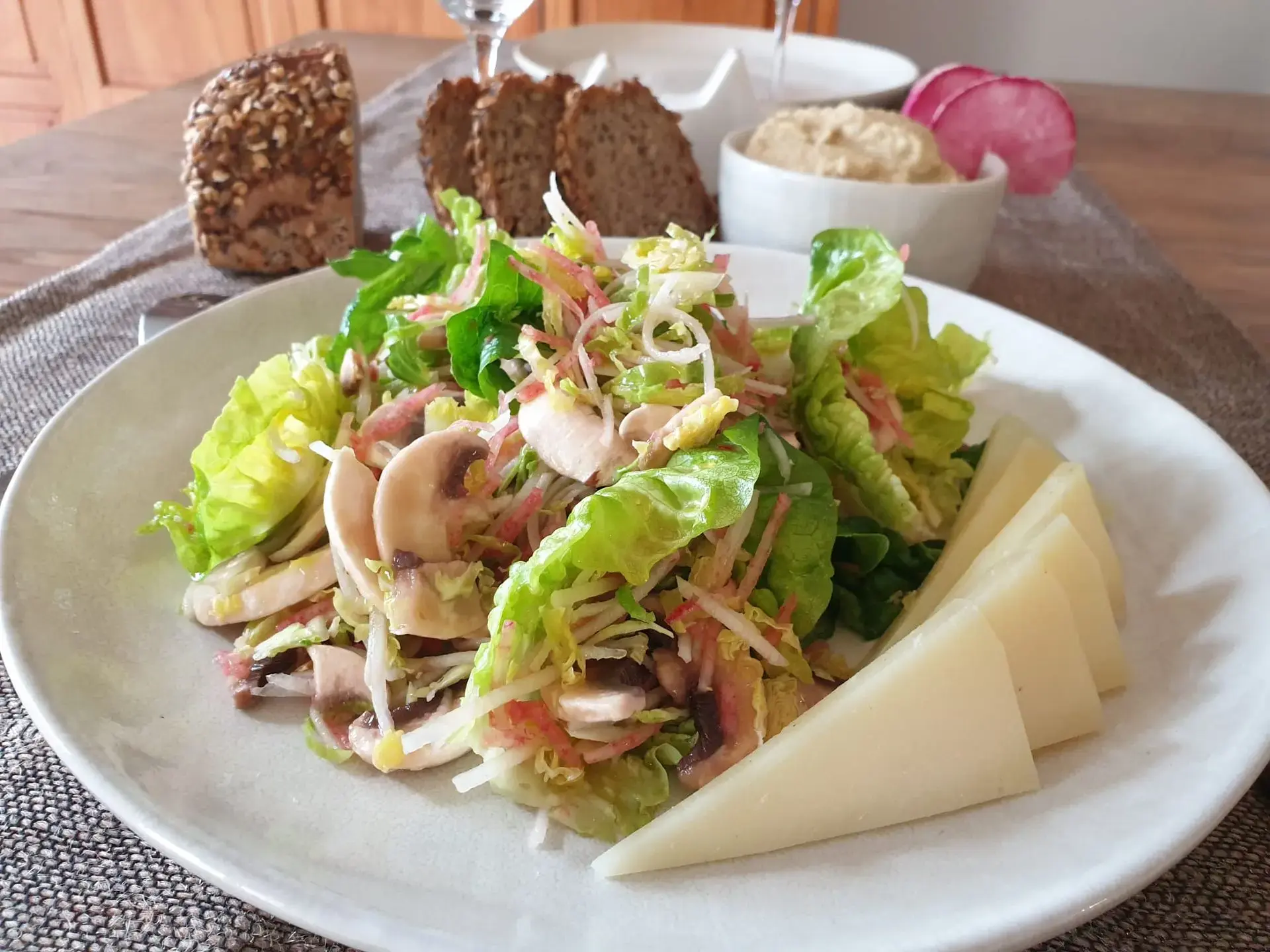 4 : Crudités : Salade "Sucrine", champignons de Paris bruns et blancs, radis rose, radis blanc, Choux de Bruxelles